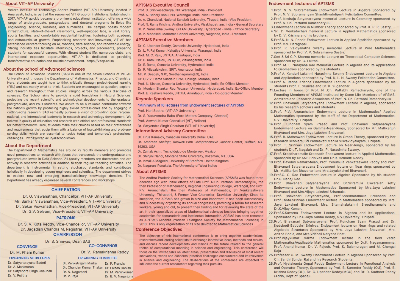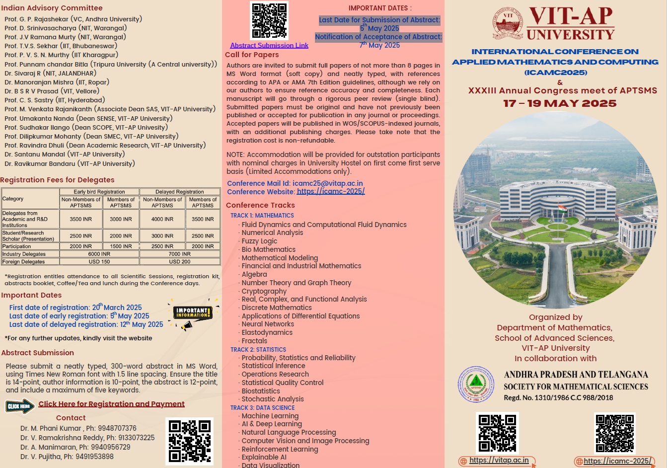 International Conference on Applied Mathematics and Computing (ICAMC2025) 17 – 19 MAY 2025 23rd Annual Congress Meet Organized by Department of Mathematics, School of Advanced Sciences, VIT-AP University In collaboration with Andhra Pradesh and Telangana Society for Mathematical Sciences.